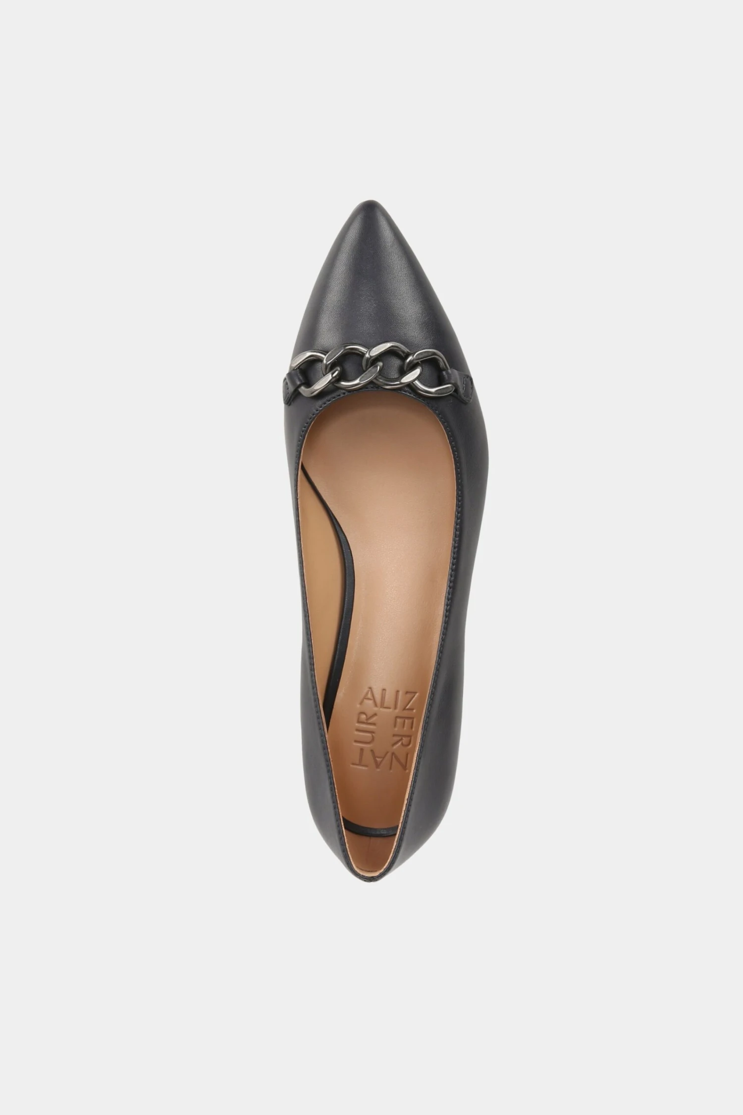 Comfort on point. Polished metallic hardware accentuates the look of this all-day, elevated dress flat. A pointed toe, cool flared block heel with a just-right height and an easy slip-on fit completes this contemporary silhouette.
