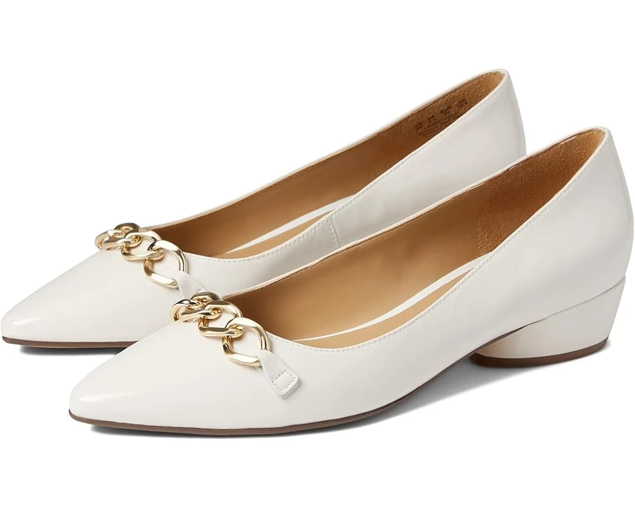 The Naturalizer® Becca has a low block heel and slip-resistant sole that ground this pointy-toe pump outfitted with a glinting chain and contoured footbed.SKU: #9593279Sharp and classic silhouette.