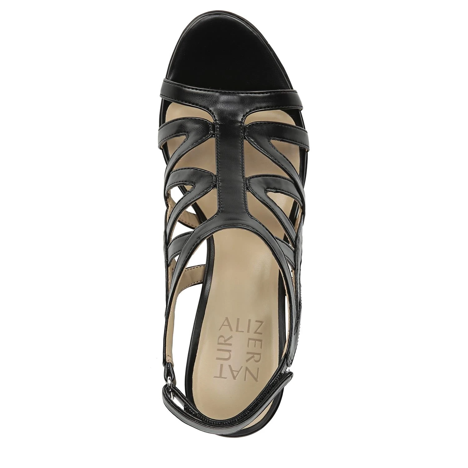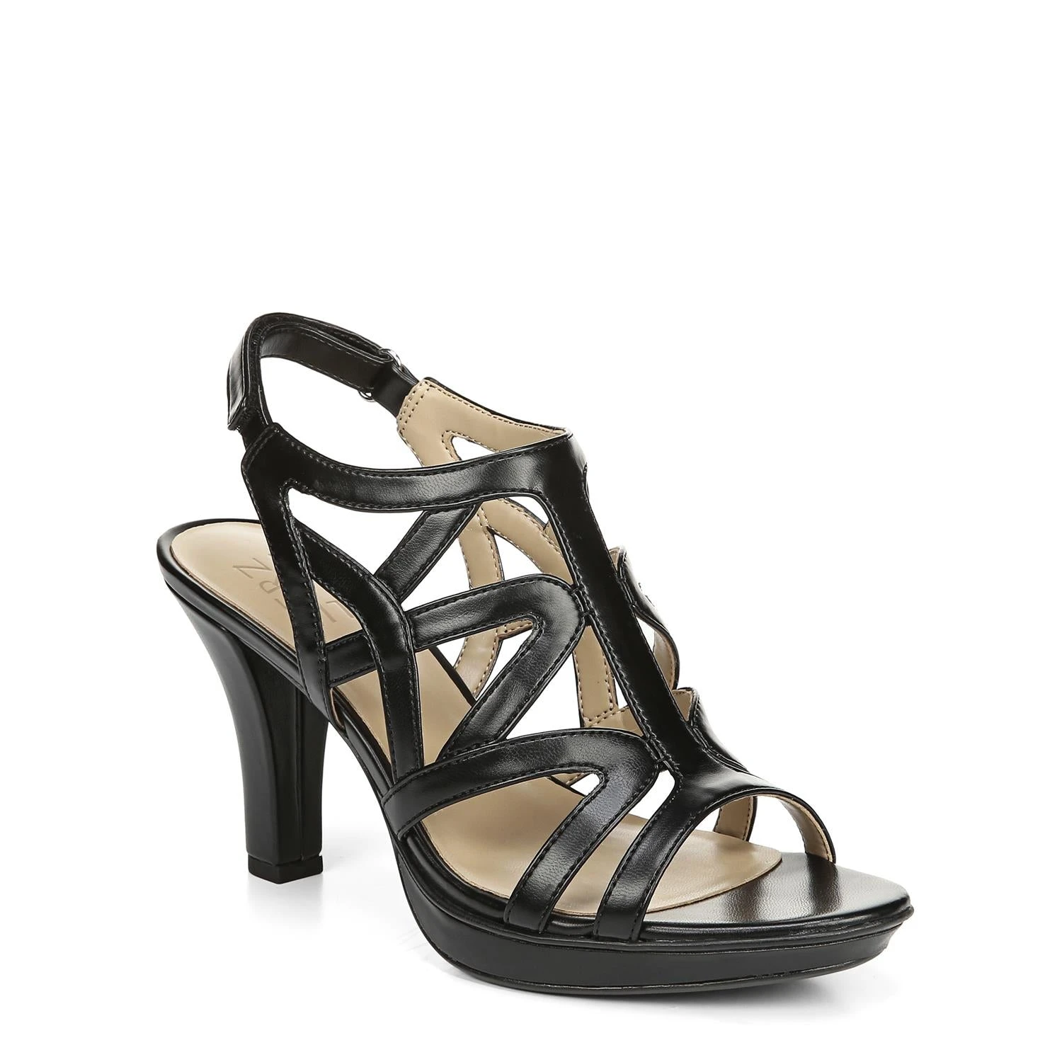 Looking great is even better when your feet are comfortable in the Danya dress sandals by Naturalizer. Faux leather upper in a strappy dress sandal style with a round, open toe Velcro® hook-and-loop heel closure Smooth lining, N5 comfort technology footbed Traction outsole 3 ½ inch wrapped heel