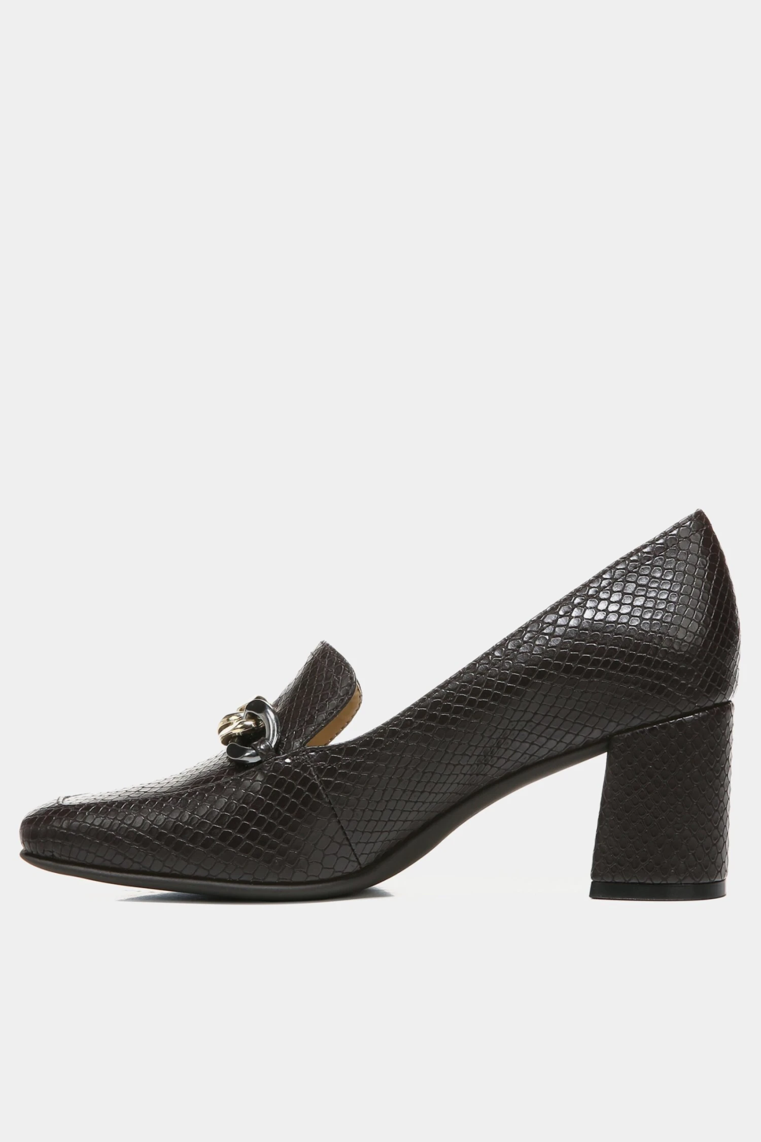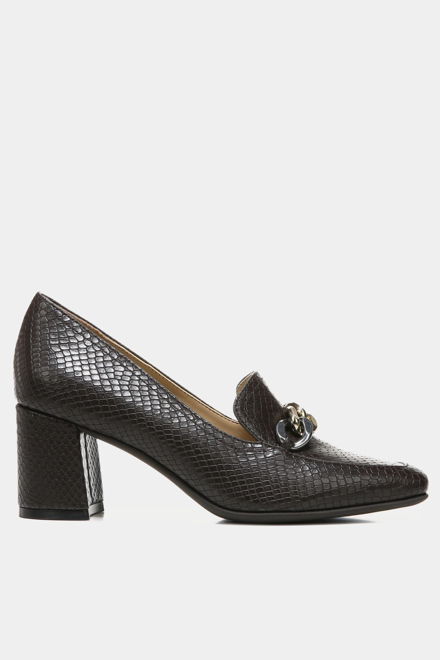 You’ll always make a statement in this square toe block heel complete with polished chain ornamentation.